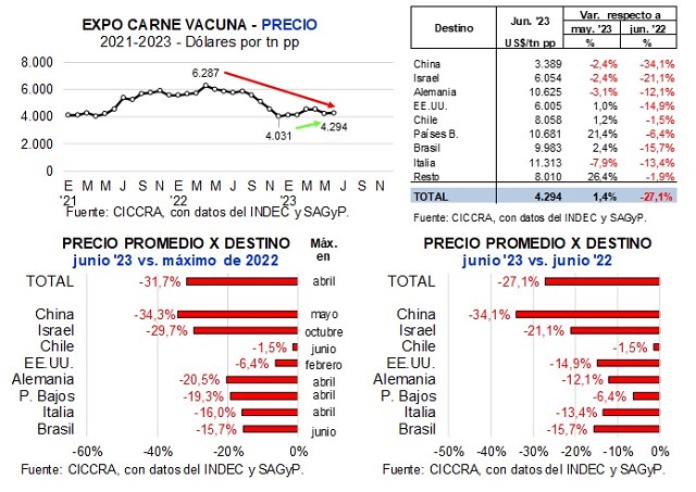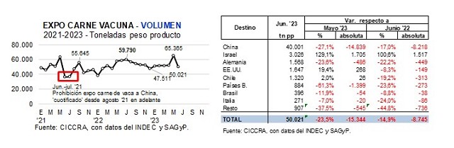 Tanto en la comparación mensual como interanual, la retracción del volumen total exportado por la industria frigorífica vacuna argentina durante junio de 2023 se explicó totalmente por el menor volumen enviado a China.