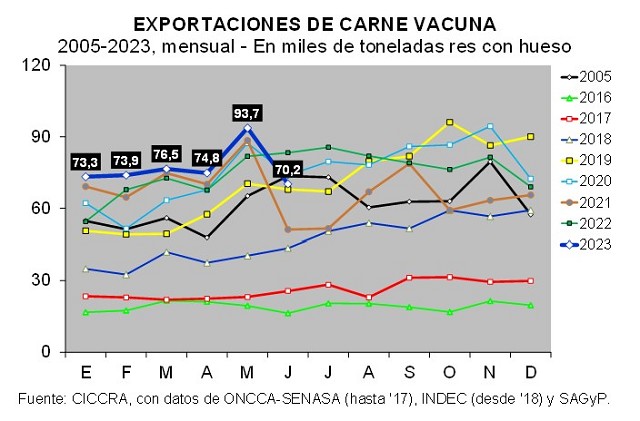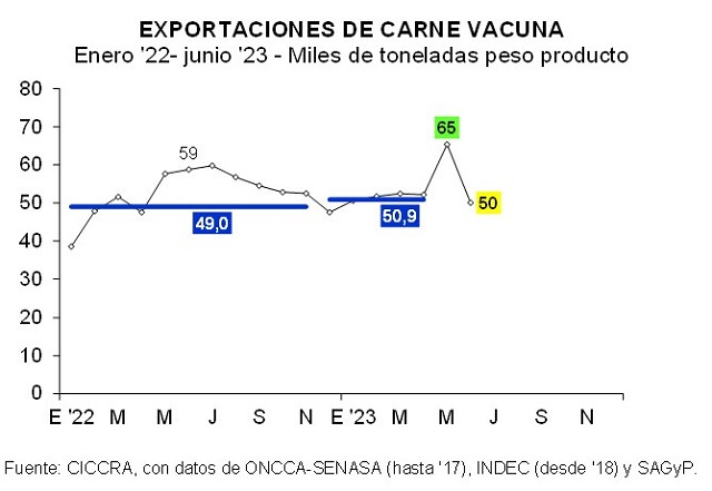 El total exportado fue equivalente a 70,2 mil toneladas res con hueso en el sexto mes del año (tn r/c/h) y el valor promedio se ubicó en 3,0 mil dólares por tn r/c/h. En el caso del volumen, la caída fue de 15,7% anual. En el caso del precio promedio, la baja llegó a 26,3% anual.