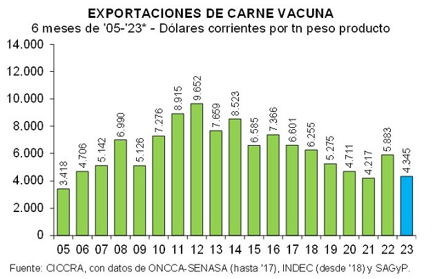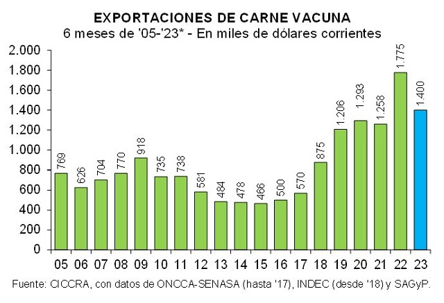 En seis mees se facturaron 1.374,6 millones de dólares, es decir 22,7% menos que en la primera mitad de 2022 (-403,0 millones de dólares), producto de la fuerte contracción que registraron los precios pagados en los principales mercados de exportación (-27,6% anual). Los cortes congelados generaron 71,5% de los ingresos totales, los frescos otro 28,3% y las carnes procesadas el restante 0,2%.
