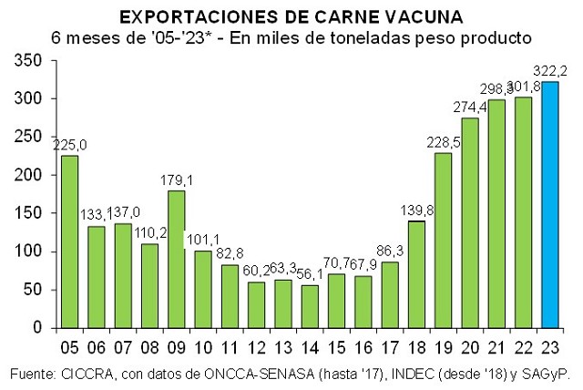 Las ventas de cortes vacunos a China sumaron un total de 254,5 mil tn pp en el primer semestre del año, llegando a representar 79,0% del total exportado por la industria frigorífica vacuna local. Se les vendió 9,9% más que en enero-junio de 2022 (+22,9 mil tn pp). En tanto, el valor unitario cayó 32,8% y se ubicó en 3.362 dólares por tn pp. Por lo tanto, los ingresos totales cayeron 26,2% anual y fueron equivalentes a 855,5 millones de dólares (62,2% del total).