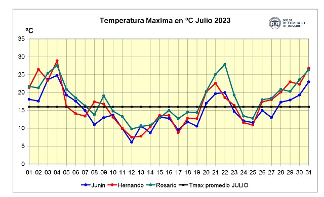 En Julio, las temperaturas máximas mostraron una evolución atípica con registros muy altos para la época del año. Hubo 3 picos de casi 30ºC, duplicando así la media mensual para la región que ronda los 15 °C. No se trató de un evento aislado, las máximas se sostuvieron 4 a 6 días. Se pueden identificar hasta tres ciclos dentro del mes con este mismo comportamiento. Como ejemplo de máximas, en Junín, Rosario y Hernando en el mes registraron picos 25, 28 y 29 °C respectivamente, es decir entre 10 y 14°C por encima de los registros normales históricos.