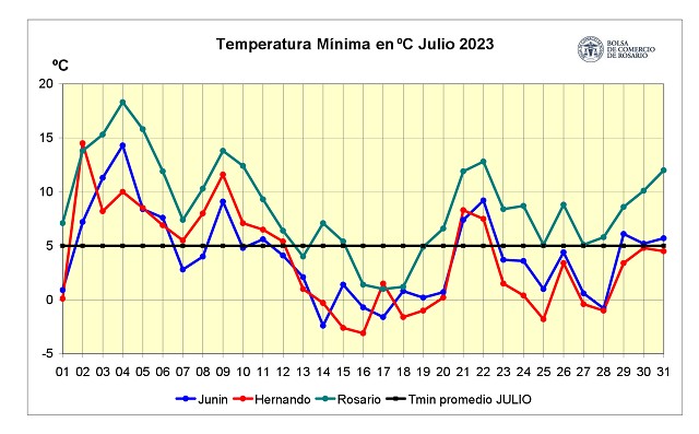 Para tener una referencia, en la región núcleo, las mínimas históricas de julio suelen estar en los 5°C. En Rosario, el promedio (de las mínimas) para julio fue de 9°C.