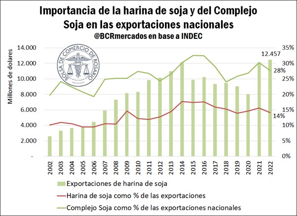Esta situación tendrá un efecto directo en el comercio exterior argentino. La harina de soja es el principal producto de exportación de la Argentina. El año pasado representó más del 14% de las exportaciones nacionales, mientras que el Complejo Soja superó el 28%. No conforme con ello, Argentina se consolidó como primer exportador mundial de harina de soja por más de 20 años, con la excepción de la actual campaña 2022/23.