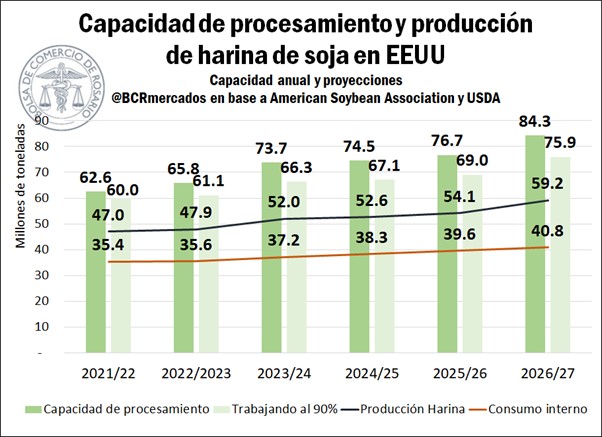 En este contexto, se espera que la capacidad instalada aumente un 28 % durante el período 2022-2026, en función de los proyectos anunciados. De esta manera, Estados Unidos podría llegar a la campaña 2026/27 con una capacidad productiva que podría superar las 84 Mt, con una producción de harina que podría superar las 59 Mt aún con capacidad ociosa en la industria.