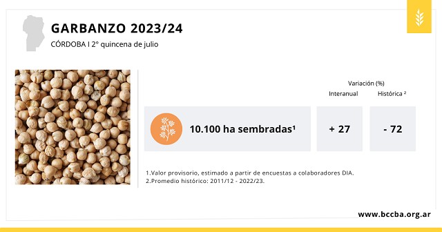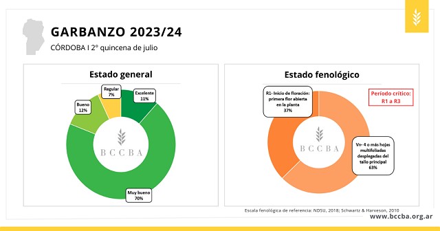 Respecto a la primera quincena de julio, disminuyó la proporción de lotes que se encontraban en excelentes condiciones y aumentaron los lotes en regular estado. Aun así, alrededor del 80 % del garbanzo sembrado en la provincia se viene desarrollando sin estrés y, en los últimos días de julio, no fueron reportadas enfermedades o plagas en el cultivo.
