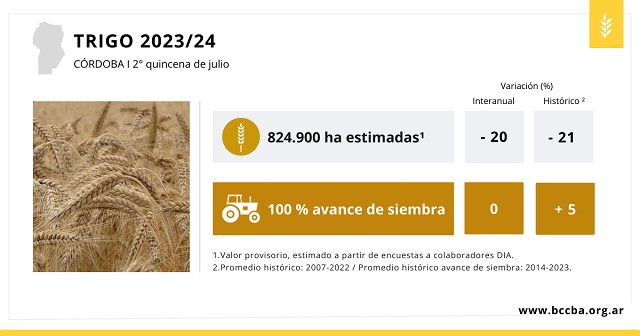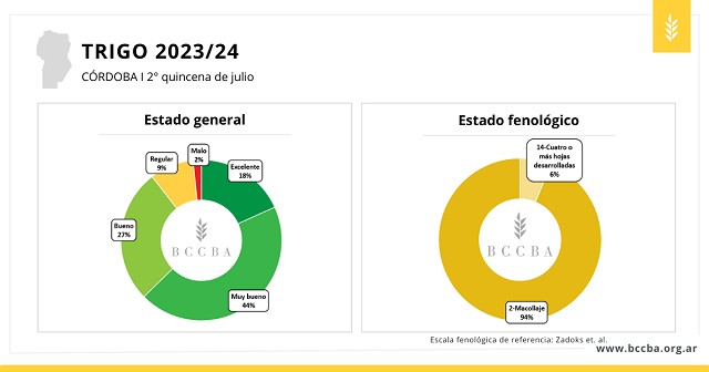 Durante los últimos días de julio casi el 90 % de la superficie triguera se encontraba entre excelentes, muy buenas y buenas condiciones gracias a las etapas fenológicas que atravesaba el trigo, donde no tiene requerimientos hídricos significativos. Aun así, colaboradores del D.I.A han reportado que en algunos lotes ya se empezó a notar la falta de agua y sumada la presencia de plagas y/o enfermedades, el 11 % del trigo se encontraba en regular y mal estado. Si la situación respecto a las lluvias no mejora en las próximas semanas, es posible que este último porcentaje aumente.