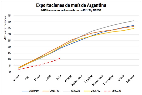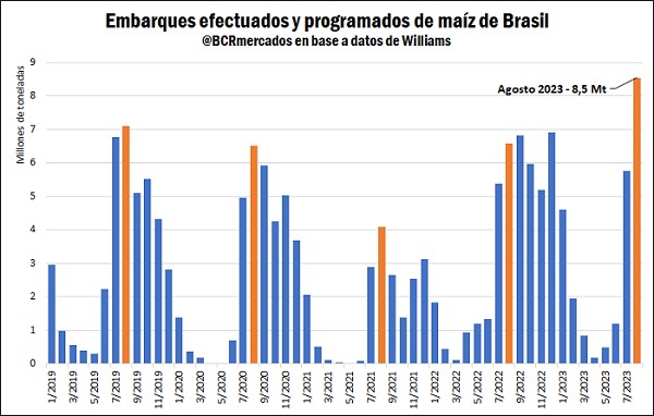 El gran ingreso de camiones de maíz a las plantas del Up-River en las últimas tres semanas, y la base de 2,6 millones de toneladas que tenemos ya para agosto entre lo embarcado en la primera semana y lo programado a la fecha en embarques para lo que queda del mes, hacen prever un nuevo repunte para agosto.