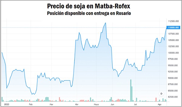 Mientras tanto, con un volumen de operaciones más humilde, los precios de la soja vienen mejorando en el último mes de manera casi ininterrumpida, y se negociaron esta semana en valores cercanos a los que imperaron durante la vigencia del PIE III, ajustando la posición disponible de Matba-Rofex en $ 110.000/t el miércoles 9 de agosto. Esto a pesar de que, fuera de una recuperación temporal en la capacidad de compra de la industria durante julio de la mano de la suba en los precios internacionales del aceite y los subproductos, el sector no podría salir a convalidar estos precios, con una capacidad teórica de compra que oscila entre los $ 95.000 y $ 100.000 por tonelada.
