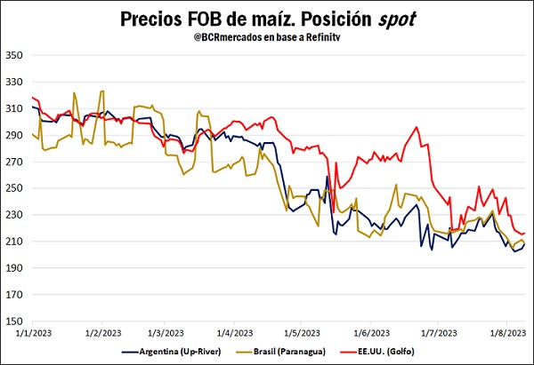 El maíz sudamericano se muestra sumamente competitivo en los mercados mundiales, en pleno ingreso del maíz de safrinha en Brasil y del maíz tardío en nuestro país, que dominó esta campaña los planteos de siembra. Aun así, en la última semana el precio del maíz del Golfo de los Estados Unidos se abarató notablemente debido a la competencia que ejercen los países sudamericanos, y en el marco de una campaña estadounidense en la que sus ventas al exterior vienen muy demoradas y con ingentes cancelaciones de embarques por parte de China (y el redireccionamiento de sus compras hacia Brasil). EE. UU. intenta liquidar sus existencias considerando que a partir de septiembre da inicio formalmente a su campaña comercial 2023/24, con una cosecha que tiene aroma a récord histórico.
