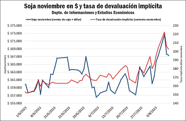 La respuesta la debemos buscar en el arbitraje que está operando en los mercados a término, donde la perspectiva devaluatoria del dólar oficial comenzó a incrementarse con la aceleración del crawling-peg de las últimas semanas, encareciendo la soja en pesos en las posiciones futuras. Así, con un noviembre que marca devaluaciones implícitas del peso argentino en torno al 200%, se convierte en un buen negocio el arbitraje temporal de la mercadería.