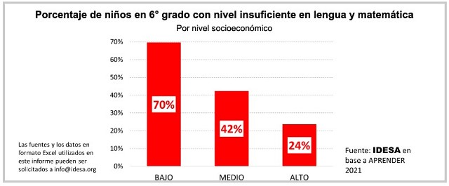 En este contexto, es pertinente observar los resultados que está dando el sistema educativo argentino por nivel socioeconómico de los jóvenes. Según las pruebas APRENDER el porcentaje de niños que terminan 6° grado con niveles insuficientes en lengua y matemática son los siguientes: