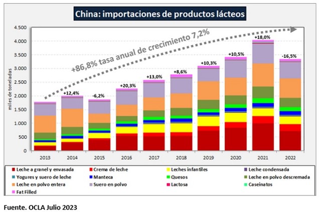 En Argentina con datos publicados por el Observatorio de la Cadena Láctea Argentina (OCLA) y con una producción anual estancada entre 10 y 11,5 mil millones de litros anuales desde hace algo más de 20 años, en 2022, (11,5 mil millones) el 25,5% tuvo como destino las exportaciones donde la Leche en Polvo (entera y descremada) y el Suero representan el 50% de las mismas. Se generaron ingresos por Exportaciones de casi 1700 millones de dólares y solo el 3,6% tuvieron como destino China y el 31 % Brasil.