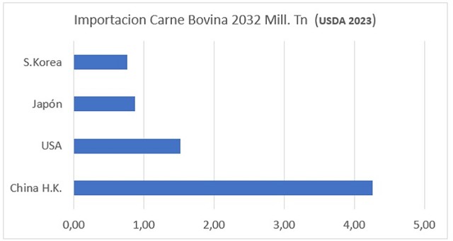 Las estimaciones de demanda al 2032 realizadas por USDA plantean en el caso de Carnes rojas una demanda anual de 4,2 mill de Tn y para el caso de carne de cerdo la demanda prevista de China y H. Kong llega a las 6 millones de Tn.