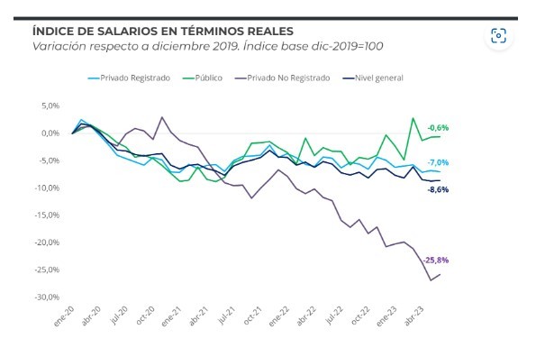 Un informe de la Fundación Libertad y Progreso en base a estadísticas oficiales señala que, desde diciembre de 2019, el índice general de salarios presentó una caída de 8,6 siendo los salarios privados no registrados los más damnificados con una caída del 25,8%.