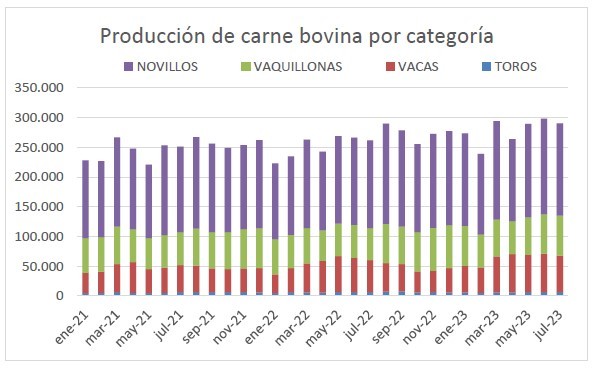 La producción de carne bovina obtenida en julio de 2023 resultó cercana a las 290,1 mil toneladas equivalente res con hueso, que implica una caída de un (-2,7%) con respecto al mes de junio; y una suba de un (+11,0%) con respecto al mes de julio del año 2022. En los primeros siete meses del año 2022, se produjeron cerca de 1,95 millones de toneladas equivalente carcasa; un (+10,7%) más que los 1,76 millones de toneladas obtenidas entre enero y julio de 2022.