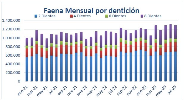 En los primeros siete meses del año 2023, se faenaron 8,61 millones de bovinos; un (+13,3%) que los 7,60 millones que se habían faenado entre enero y julio de 2022. Los mayores aportes al incremento de la faena provienen de los machos de dos dientes, que superaron en casi 300 mil cabezas la faena acumulada en los primeros siete meses del año pasado, por las hembras de ocho y más dientes, cuya faena superó en cerca de 227 mil cabezas a la registrado entre enero y julio del año 2022, y por las hembras de dos dientes que acumularon 243 mil cabezas faenadas más que en el mismo periodo del año pasado.