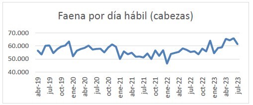 La faena del séptimo mes del año 2023 se ubicó en aproximadamente 1,287 millones de cabezas de ganado bovino procesadas. Esto implica una caída mensual, con respecto a junio del (-2,3%), que equivale a unos 30,8 mil animales; y un alza de un (+16,3%) con respecto al mes de julio de 2022, que equivale a poco más de 180 mil cabezas. Ajustado por la cantidad de días hábiles del mes, que fueron 21, se produjo una caída moderada con respecto a los 20 días hábiles de junio, que resultó del (-7,0%), y la faena diaria alcanzó en julio las 61,3 mil cabezas, quedando moderadamente por debajo de las 65,9 mil diarias, promedio, de junio último.
