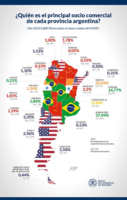 En términos de socios comerciales, Estados Unidos es el principal destino de exportación para nueve provincias argentinas, mientras que China lidera como principal destino exportador en ocho provincias. Brasil destaca como destino principal en cuatro provincias, siendo trigo, bienes de la industria automotriz y vinos los productos más relevantes en su canasta exportadora.