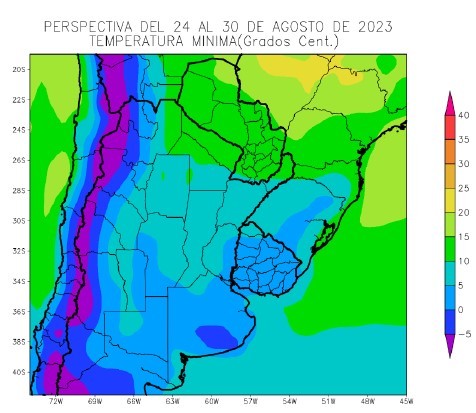 • El este de Salta, la Región del Chaco, gran parte Misiones y la mayor parte del Paraguay observarán temperaturas mínimas superiores a 10°C, con un foco con valores superiores a 15°Cy otros con valores inferiores.