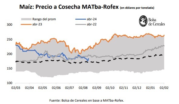 Ante este panorama, la cotización de la primera posición del maíz en el mercado de Chicago ha registrado una disminución del 12% en comparación con el mes anterior, acumulando así una caída del 30% desde el inicio del año, con las posiciones futuras acompañando esa tendencia. A nivel doméstico, el precio a cosecha del maíz en el mercado de futuros MATba-Rofex para abril de 2024 se sitúa en 186 USD/tn, un 12% por debajo respecto a los valores del año anterior, pero manteniéndose un 8% por encima del promedio de las últimas 5 campañas.