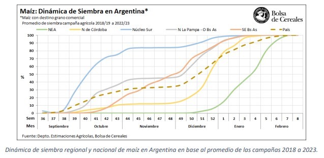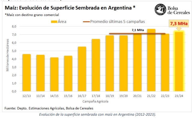 El cereal de verano tiene una ventana de siembra que va desde mediados del mes de agosto en el centro del área agrícola y se extiende hasta las primeras semanas de febrero en el norte. El escenario inicial muestra con una tendencia levemente positiva al total de maíz, fundamentalmente para los planteos tempranos comparando con el ciclo 2022/23. Esto tiene que ver con el fuerte déficit hídrico a la siembra que tuvo lugar en el ciclo anterior y que generaron el atraso en la misma. Por lo tanto, la intención es que la proporción temprano/tardío vuelva a valores normales, aunque sujeto a la disponibilidad hídrica durante los meses de septiembre y octubre. Las principales variables que tienen significancia a la hora de decidir sembrar maíz en este nuevo ciclo son: el nivel de reservas hídricas inicial de cara al comienzo de la ventana de siembra de los maíces tempranos, disponibilidad y precio de los insumos, superficie que ha dejado liberada el trigo y el girasol, un precio del cereal inferior a la campaña previa y la necesidad de sembrar para cubrir el bache que dejo el ciclo anterior. Frente a este panorama, se proyecta una superficie total destinada al maíz con destino grano comercial de 7.300.000 hectáreas para la nueva campaña, sujeta a la evolución de variables económicas y del tiempo (lluvias, temperaturas, etc.) durante la extensa ventana de siembra.