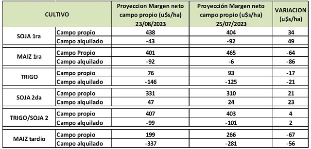 Similar situación se da en el trigo. Contrariamente, tanto la soja de primera como la de segunda muestran un repunte en su rentabilidad, debido al aumento intermensual del precio de la oleaginosa. Esta mejora en los números de la oleaginosa impacta también en la rentabilidad del doble cultivo trigo/soja, si bien es una mejoría acotada de 4 u$s/ha en campo propio y de 2 u$s/ha en campo alquilado.