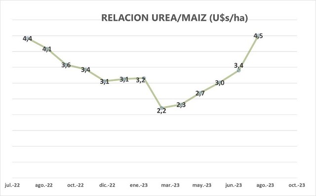 En el último mes, hubo una suba importante de fertilizantes. La urea, el más usado por los productores de maíz, aumentó 150 u$s/tn. Como en ese mismo período el precio del maíz cayó, hubo un impacto directo en la relación insumo producto (precio de la tonelada de urea /precio de la tonelada de cereal), que se encuentra en el nivel más alto desde los últimos 12 meses: 4,5. Esto quiere decir que se requiere producir 4,5 tn de maíz por cada tn de urea que se quiera adquirir.