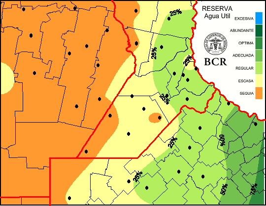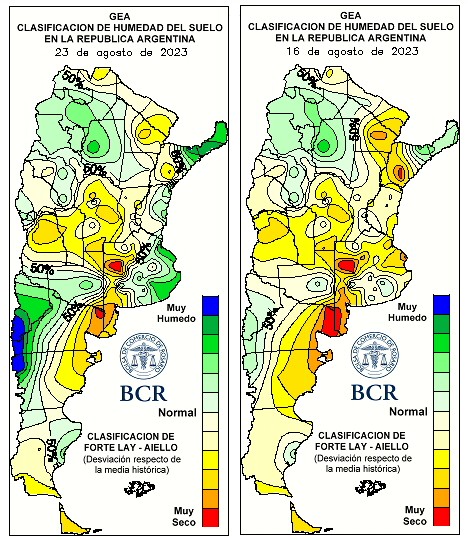 La condición de sequía, que predomina sobre el oeste de la zona núcleo, comienza a extenderse hacia el este. El elevado requerimiento hídrico provoca una enorme incertidumbre a días de comenzar la siembra de maíz temprano. En el centro-oeste del área GEA se requieren, en los próximos quince días, lluvias que logren dejar entre 60 a 120 mm en los suelos para lograr un estado óptimo en las reservas de agua, considerando el primer metro. Este escenario se vuelve más delicado si se considera que los pronósticos de corto plazo indican que la última semana del mes no muestran lluvias.
