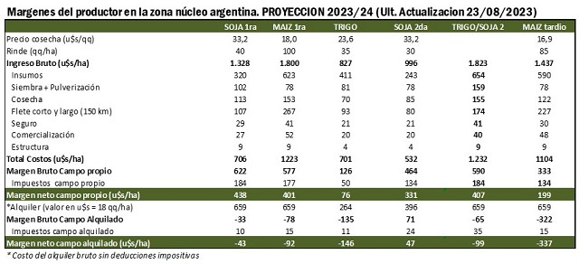 Tras las últimas dos semanas de cambios rotundos en las condiciones de mercado, la última actualización de márgenes, realizada al 23 agosto, exhibe la baja del precio de los granos y la suba de uno de los principales insumos: la urea. El costo por hectárea de este fertilizante pasó de U$S 660 a U$S 811 en un mes. En el segundo cuadro se aprecia la caída de U$S 64 /ha en los márgenes netos del maíz para campo propio y de U$S 86 para el alquilado.