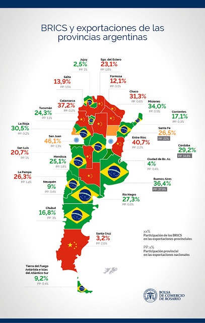 Otras provincias que tienen un elevado volumen de sus exportaciones con los BRICS como destino son Entre Ríos, Catamarca, Buenos Aires, Misiones, Chaco y La Rioja. Si bien estas provincias son muy heterogéneas en su peso exportador y en sus canastas exportadoras, cada una de ellas tiene a los países miembro de este bloque como destino de más del 30% de sus exportaciones.