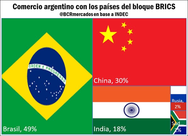 China y Brasil destacan como los destinos más preponderantes en lo que hace al comercio de Argentina con este bloque. Mientras el gigante asiático es un cliente clave para las carnes y el poroto de soja argentino, Brasil es fundamental para el trigo y la industria automotriz. Por otra parte, el comercio con Rusia y Sudáfrica está mucho más recortado, con ambos países representando menos del 2% de las exportaciones al bloque. Rusia compra eminentemente harina de soja, además de peras, manzanas y limones. Por su parte, Sudáfrica adquiere trigo, harina de soja y variados productos de la industria alimentaria nacional.