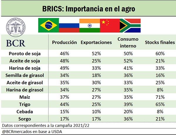 En un informe anterior se destacaba el posicionamiento agroalimentario de los países del bloque: China e India como principales productores y consumidores globales de trigo, Rusia como su principal exportador. Brasil como principal exportador mundial de maíz y soja. China y Rusia como principales consumidores mundiales de cebada. El principal depósito mundial de maíz y soja, con China como epicentro. Rusia y Argentina como jugadores globales en la exportación de aceite de girasol. Enormes volúmenes de análisis adicionales pueden realizarse en vista de la importancia de estos mercados de producción y consumo de productos agrícolas. Asimismo, Sudáfrica tiene un rol preponderante en la provisión de oro, platino, hierro y carbón. Rusia es uno de los principales exportadores mundial de gas y petróleo.