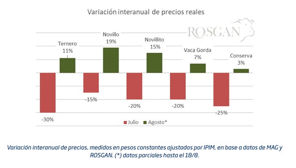Del mismo modo, los valores de la hacienda para faena respondieron con subas nominales de más del 30% en la última semana y de casi el 50% en lo que va de agosto.