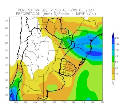 Al inicio de la perspectiva, se completará el paso del frente que hizo su entrada en la etapa anterior, coincidentemente con la Festividad de Santa Rosa, produciendo precipitaciones predominantemente escasas a nulas, salvo focos de tormentas sobre la Cordillera Sur y Central, algunas lluvias moderadas en el este de La Pampa y Buenos Aires y precipitaciones de variada intensidad sobre el Paraguay y un foco de tormentas sobre la Pcia Argentina de Misiones. Los vientos polares, que acompañaron el paso del frente, causarán un marcado descenso térmico, con heladas generales en el oeste del área agrícola, y heladas localizadas en gran parte de la franja atlántica, mientras el centro observará registros térmicos más benignos. El proceso se completará con el retorno de los vientos del trópico, causando un incremento general de la temperatura, con registros superiores a la media en el norte del área agrícola, normales en el centro, y bajo lo normal en el sur y la franja atlántica.