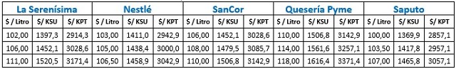 En la cuenca oeste de Bs. As., para una leche libre de brucelosis y tuberculosis, con 3.80 grasa y 3.50% proteína, 25.000 UFC, 300.000 CCS y remitida a 4.0 ºC. Se trata de una estimación genérica y -como tal- sólo orientativa, referida a algunas de las principales empresas que operan en la región. Se toma “anillo 2” de planta Gral. Rodríguez de La Serenísima. La 1º fila, se refiere a un tambo de 2500 litros/día, la 2° corresponde a un tambo de 5000 litros/día, y la 3º hace referencia a un tambo de 10000 litros/día. Los precios se expresan en $/Litro, $/KSU (Kg de sólidos útiles), y $/KPT (Kg de proteínas totales). EN LA DISPERSIÓN DE PRECIOS, SE UBICAN POR ENCIMA DE LO PUBLICADO, LO OBTENIDO POR GRUPOS DE COMERCIALIZACIÓN O EN ARREGLOS ESPECIALES. ES UN % VARIABLE Y DINÁMICO, QUE ES COMPLEJO RELEVAR Y ESTIMAR EN FORMA FIDEDIGNA Y REGULAR.