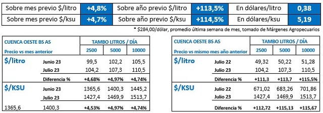 Los precios más frecuentes en la cuenca oeste para los tipos de tambos considerados, rondaron estos valores.