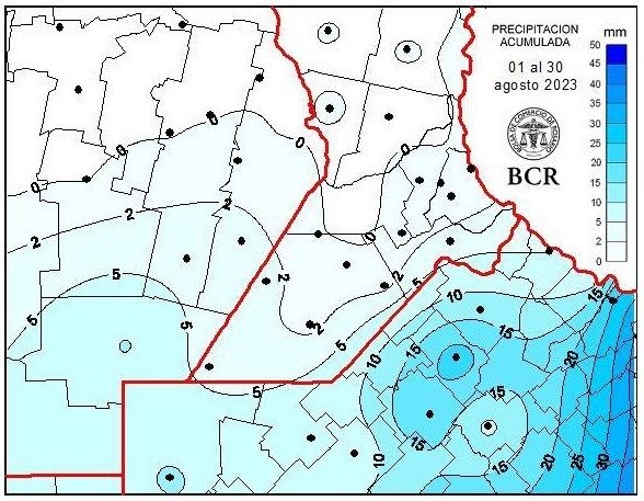 La región núcleo despide agosto con muy poca agua. En todo el mes suele llover entre 10 mm en el sector oeste y 30 mm en el este. Sin embargo, el promedio acumulado mensual de toda la región es de 4 mm. Como se puede apreciar en el mapa, las localidades del NE bonaerense son las que se quedaron con la mayor carga de agua.
