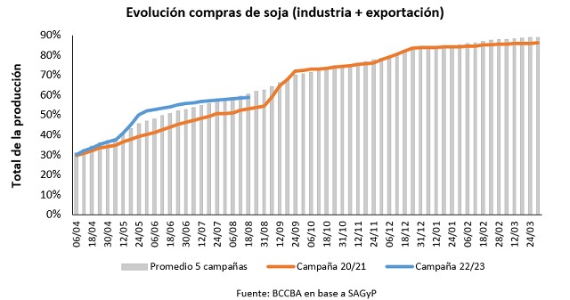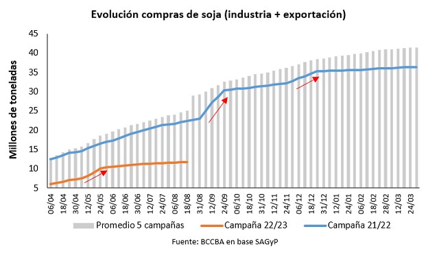 Las compras por parte de los industriales y exportadores como porcentaje de la producción total se ubican por encima de lo observado respecto al ciclo anterior comenzando más aceleradamente, lo cual exhibe un comportamiento racional por parte de los participantes del mercado ya que al ser menor la oferta disponible adelantar compras para evitar posibles problemas de abastecimiento a futuro resulta conveniente.