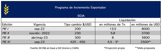 Los distintos programas han representado una oportunidad para los productores, incentivando a un aumento del volumen comercializado, y una vez finalizados, prácticamente se detiene la compraventa de granos. El programa que mayor volumen de toneladas comercializadas presentó fue el PIE I, liquidando aproximadamente USD 8000 millones. El PIE II alcanzó un menor volumen respecto su antecesor, debido a su temporalidad y a que la mayoría de los productores (especialmente pequeños y medianos) aprovecharon el PIE I para vender a un precio más competitivo y así afrontar sus obligaciones. Luego el PIE III, ubicándose en una de las peores campañas en cuanto a condiciones agrometeorológicas y productivas, alcanzó una comercialización de aproximadamente de 8 millones de toneladas, generando 5600 millones de dólares. Estos programas pueden verse reflejados también en la dinámica de compras por parte de industriales y exportadores.