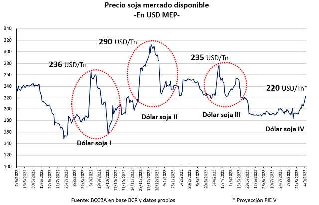 Quedando pendiente a comercializar alrededor de 8 millones de toneladas de las cuales 3,8 se encuentran pendientes a fijar precio, incentivado por el actual contexto económico dentro del “Programa de Fortalecimiento de la Actividad Económica y del Ingreso” se lanzó el PIE IV, a través del Decreto 443/2023, un nuevo dólar soja en el cual los exportadores de harina y aceite de soja tendrán un 25% de disponibilidad de las divisas que liquidan, las cuales podrán ser liquidadas al dólar contado con liquidación (CCL) y el restante 75% se liquidarán en el Mercado Único y Libre de Cambio (MULC). A diferencia de los PIE anteriores, donde se fijaba un tipo de cambio diferencial que incidía directamente en el precio recibido por el productor, esta medida busca elevar los ingresos de los exportadores y que en consecuencia puedan pagar un precio mayor en el mercado interno. De esta manera, se estima que el precio podría rondar en promedio los $ 150.000 Tn, y así incentivar al productor que tenga soja, a vender. Por otro lado, según ha expresado el Gobierno Nacional, la medida busca además mantener el empleo de los trabajadores de las plantas de crushing, las cuales se estima que este año importen aproximadamente 10 millones de toneladas, récord histórico, consecuencia de una gran capacidad instalada, la cual no pudo ser abastecida por la producción de la campaña 2022/23.