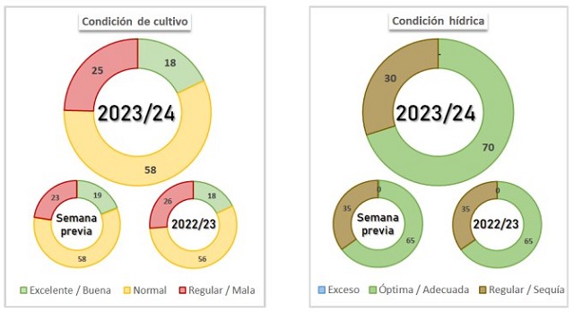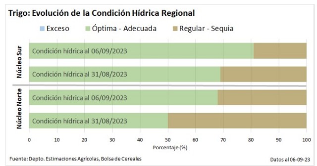 El área sembrada se encuentra entre macollaje e inicio de espigazón. Las últimas precipitaciones mejoran la condición hídrica de los cuadros implantados sobre ambos núcleos donde el 11 % transita desde espigazón.