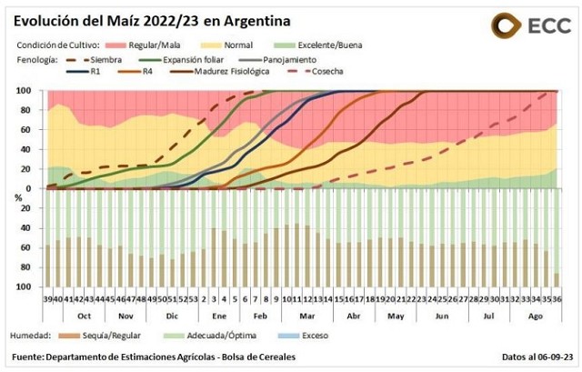 Para el cultivo de cebada, precipitaciones ocurridas oportunamente durante los últimos días, han mejorado la condición hídrica de los lotes implantados sobre ambos núcleos, sur y norte, donde el 41 % ya ha iniciado la etapa de encañazón y el 11 % ya transita desde espigazón. Sobre el Norte de La Pampa-Oeste de Buenos Aires, donde el 85 % de la superficie implantada se encuentra en pleno macollaje la falta de humedad condiciona el rendimiento potencial de dichos cuadros. Finalmente, sobre el sur de Buenos Aires, donde la condición hídrica de los cuadros implantados se encuentra entre Adecuada a Optima, salvo excepciones, 652 mHa se encuentran en pleno macollaje, con óptimas condiciones de cultivo. Cabe, además, destacar la ocurrencia de heladas para dicha zona durante la última semana que podría causar algún daño foliar.