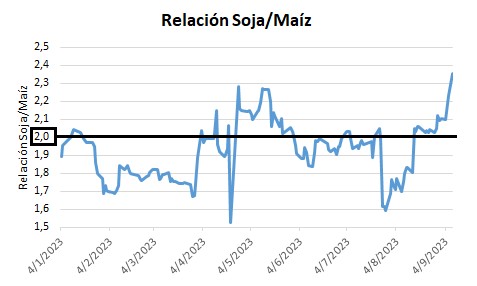 En el gráfico se observa que, solo entre abril y mayo, y desde mediados de agosto en adelante, el precio disponible de la soja en PESOS superaba en más de dos veces al precio del maíz, pero con el actual precio de soja, se alcanza una relación de 2,4, relación más alta del año.