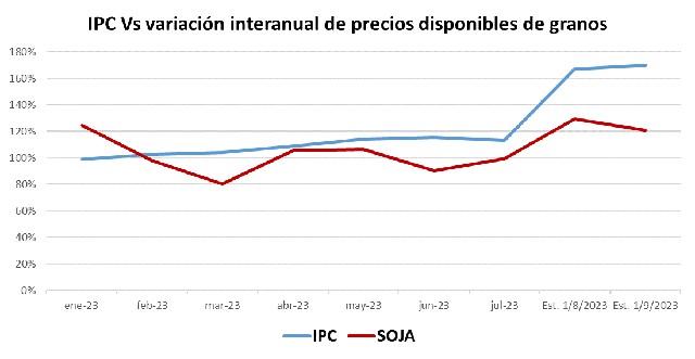 Compra de bienes y servicios de consumo: El poder adquisitivo de las liquidaciones de granos, destinadas a comprar bienes y servicios de consumo, disminuyeron mes a mes durante el 2023. La evolución anual del Índice de Precios al Consumidor fue mayor al crecimiento anual de precios disponibles de granos en PESOS, desde febrero. Es decir que cada mes, el poder adquisitivo de una tonelada de soja fue inferior al poder adquisitivo del mismo mes un año atrás. La evolución de precios en PESOS de los granos fue inferior respecto de la inflación. Es otro motivo para liquidar e invertir en instrumentos financieros que ofrezcan tasas de interés que preserven valor respecto de la inflación. Preservar mercadería para consumo, expone a la mercadería a la baja en Dólares, y que el tipo de cambio no apalanque esas bajas.