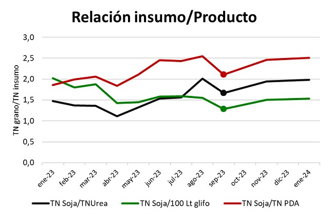 Compra de insumos: Siempre que los insumos puedan ser preciados, se observa que las subas actuales de precios en soja, que a tipo de cambio oficial resulta en un promedio de U$S 450/TN, se traducen en mejor relación insumo producto. La capacidad de compra de Urea era de 2 toneladas de soja por cada tonelada de urea, mientras al precio promedio actual es de 1,7. Lo mismo ocurre con otros insumos, por poner dos ejemplos más se muestra el glifosato y el fosfato di amónico.
