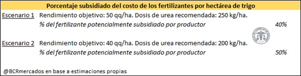 Teniendo en cuenta distintos escenarios productivos, de acuerdo con el rendimiento objetivo esperado por cada productor, la proporción subsidiada del costo del insumo podría incluso disminuir. A modo de ejemplo, el siguiente cuadro resume dos escenarios alternativos. Cabe aclarar que el uso final de fertilizante depende de cada caso particular y necesidades puntuales de nutrición del suelo.