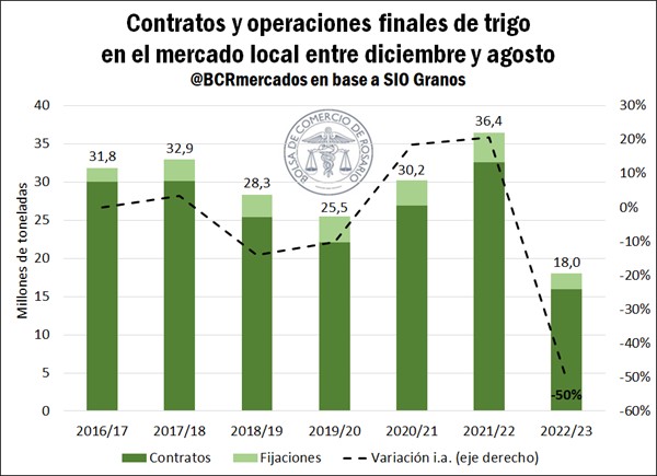 Ya es sabido que la sequía que tuvo lugar durante el transcurso de la campaña actual disminuyó la cosecha en proporciones sin precedentes, por lo que se estima que la producción del cereal para la campaña 2022/23 totalizaría 11,5 Mt. Como consecuencia de esta estrepitosa caída en los niveles de producción, se observa también una drástica disminución en los volúmenes de comercialización de trigo en el mercado local.