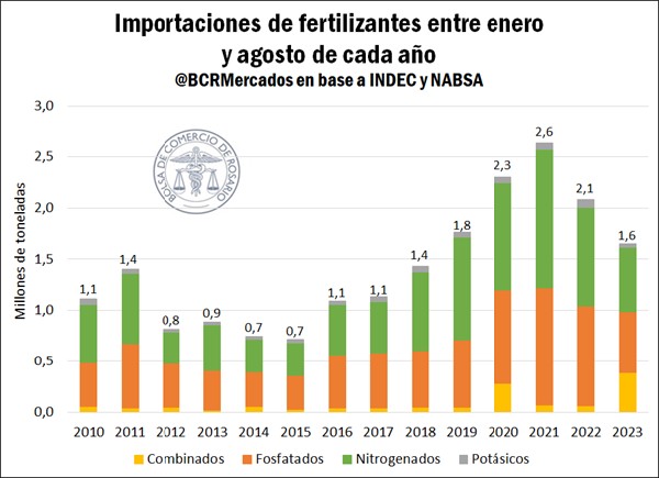 En este contexto, un punto a destacar, como se puede observar en el siguiente gráfico, es que la importación de fertilizantes durante los primeros ocho meses de 2023 disminuyó un 21% en relación con el mismo período del año anterior. Esto cobra mayor relevancia si se tiene en cuenta que Argentina importa la mayor parte de los fertilizantes que utiliza en la producción. Mientras que en nuestro país produce cerca de la mitad de la urea que se consume a nivel local, el restante de los productos ingresa desde el extranjero.