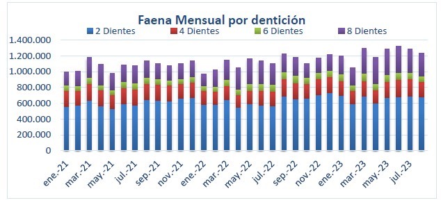 En los primeros ocho meses del año 2023, se faenaron 9,85 millones de bovinos; un (+11,5%) que los 8,83 millones que se habían faenado entre enero y agosto de 2022. Los mayores aportes al incremento de la faena provienen de los machos de dos dientes, que superaron en 272 mil cabezas la faena acumulada en los primeros ocho meses del año pasado, por las hembras de ocho y más dientes, cuya faena superó en más de 307 mil cabezas a la registrado entre enero y agosto del año 2022, y por las hembras de dos dientes que acumularon 260 mil cabezas faenadas más que en el mismo periodo del año pasado.