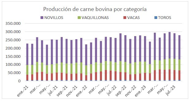 La producción de carne bovina del mes de agosto de 2023 alcanzó las 278,7 mil toneladas res con hueso, retrocediendo en 11,9 mil toneladas con respecto al mes anterior; y recortándose, en 11,0 mil toneladas, con respecto al mes de agosto del año pasado. En los primeros ocho meses del año 2023, la producción de carne bovina alcanzó los 2,23 millones de toneladas equivalente res con hueso; situándose 177,9 mil toneladas por encima del acumulado del período enero a agosto de 2022, que había ascendido a 2,05 millones de toneladas equivalente res con hueso.